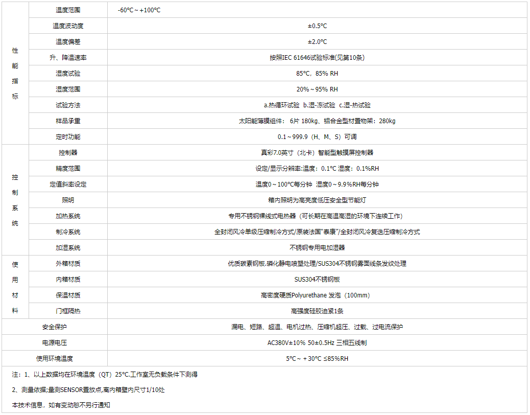 光伏濕凍試驗箱適用于光伏組件(太陽能電池板)做熱循環(huán)、濕凍循環(huán)、高溫高濕雙85試驗,以確認組件能否承受高溫高濕之后隨之的負溫度影響,以及對于溫度重復變化時引起的疲勞和熱失效,另外確定光伏組件曝露在高濕度下而產生的熱應力及能夠抵抗?jié)駳忾L期滲透的能力.是光伏組件行業(yè)必不可少的測試設備。