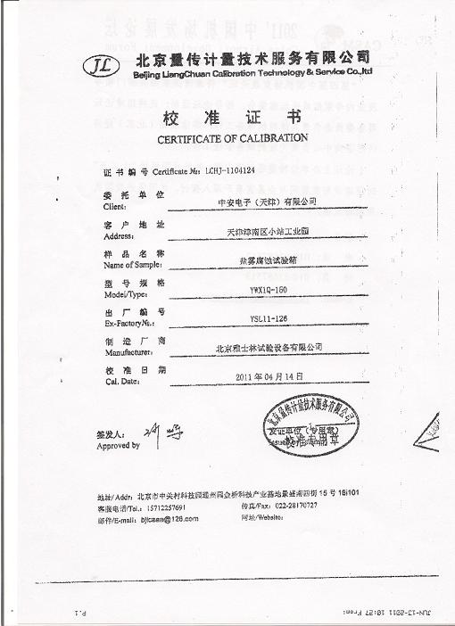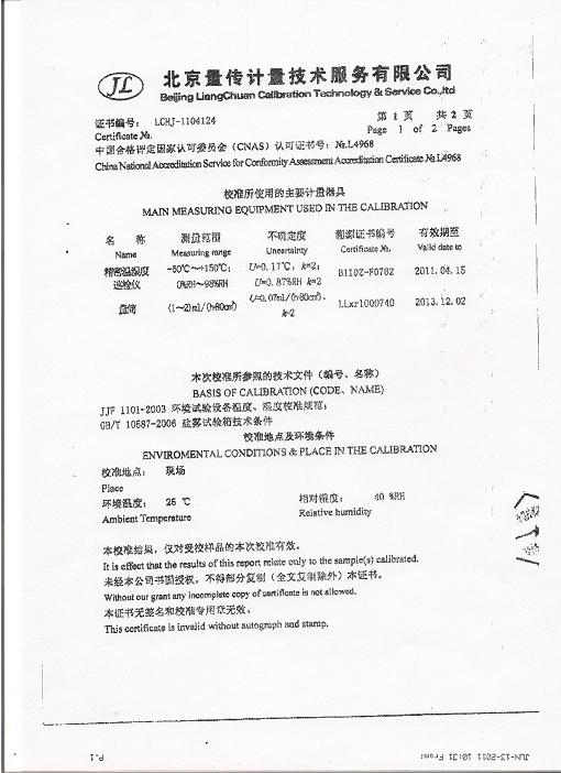 >>鹽霧腐蝕試驗箱校準證書-北京量傳計量-中安電子 |