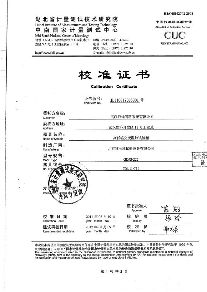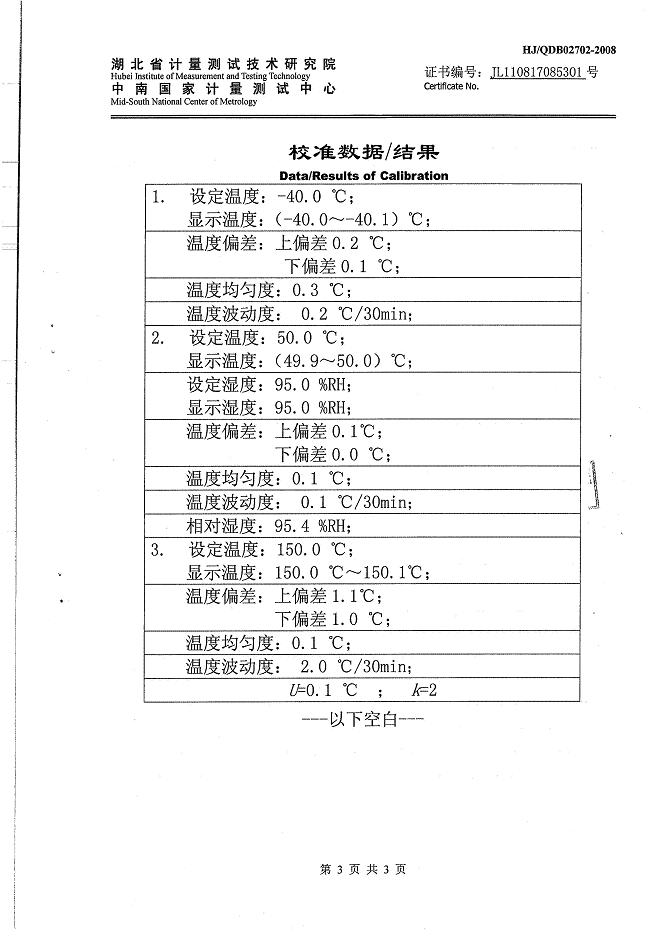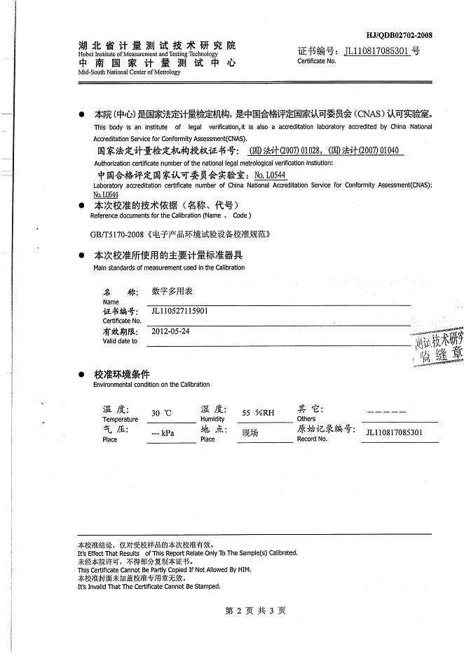 >>高低溫交變濕熱試驗(yàn)箱校準(zhǔn)證書-湖北計(jì)量院-武漢邦迪 |