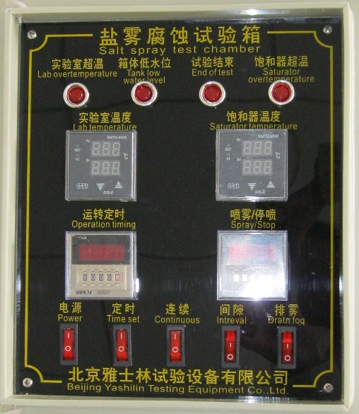 控制面板是鹽霧腐蝕試驗(yàn)箱的心臟,試驗(yàn)步驟都是通過控制面板上設(shè)定的,為了方便用戶對(duì)試驗(yàn)箱的操作,下面為您講述控制面板功能說明: 實(shí)驗(yàn)室超溫:當(dāng)鹽霧試驗(yàn)箱工作室溫度超過試驗(yàn)設(shè)定值一定范圍時(shí),此報(bào)警燈亮。 箱體低水位:鹽霧腐蝕試驗(yàn)箱在試驗(yàn)過程中缺水時(shí),此報(bào)警燈亮。 試驗(yàn)結(jié)束:當(dāng)試驗(yàn)運(yùn)轉(zhuǎn)時(shí)間到達(dá)設(shè)定值時(shí),此燈亮(設(shè)備停止工作)。 飽和器超溫:當(dāng)飽和器溫度超出空氣開關(guān)設(shè)定值一定范圍時(shí),此報(bào)警燈亮。 實(shí)驗(yàn)室溫度:顯示試驗(yàn)過程中實(shí)驗(yàn)室的實(shí)際溫度和設(shè)定溫度。 飽和器溫度:顯示試驗(yàn)過程中飽和器的實(shí)際溫度與設(shè)定溫度。 運(yùn)轉(zhuǎn)定時(shí):對(duì)試驗(yàn)時(shí)間進(jìn)行實(shí)時(shí)設(shè)定,試驗(yàn)時(shí)間到達(dá)設(shè)定值,設(shè)備停止運(yùn)轉(zhuǎn)。 噴霧/停噴:此定時(shí)器是噴霧時(shí)間設(shè)定、停噴時(shí)間設(shè)定、時(shí)間單位選擇。 排霧:試驗(yàn)結(jié)束時(shí),按下此按鈕,將試驗(yàn)箱內(nèi)的鹽霧氣體趕出,通過排霧口排出。 間隙:按下此按鈕,噴霧塔將按計(jì)時(shí)器設(shè)定的時(shí)間進(jìn)行間隙性噴霧。 連續(xù):按下些按鈕,噴霧塔進(jìn)行連續(xù)噴霧。 定時(shí):按下此按鈕才可以對(duì)設(shè)備進(jìn)行試驗(yàn)運(yùn)轉(zhuǎn)總時(shí)間定時(shí)。 電源:設(shè)備通電工作。