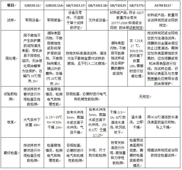 | 鹽霧試驗箱不同標(biāo)準(zhǔn)對試樣處理和檢測的要求 |